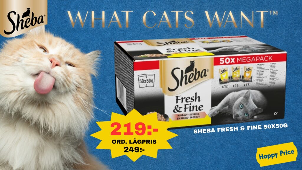 Här är en av våra Sheba Fresh & Fine Storpack (50x50g) som blir er för 219:- (rek. lågpris 249:-)! Vi har även Sheba Sauce storpack (40x85g) för samma pris och Whiskas storpack (60-pack) för 249:-! ”Om katten själv får välja”, som Whiskas hade som slogan!